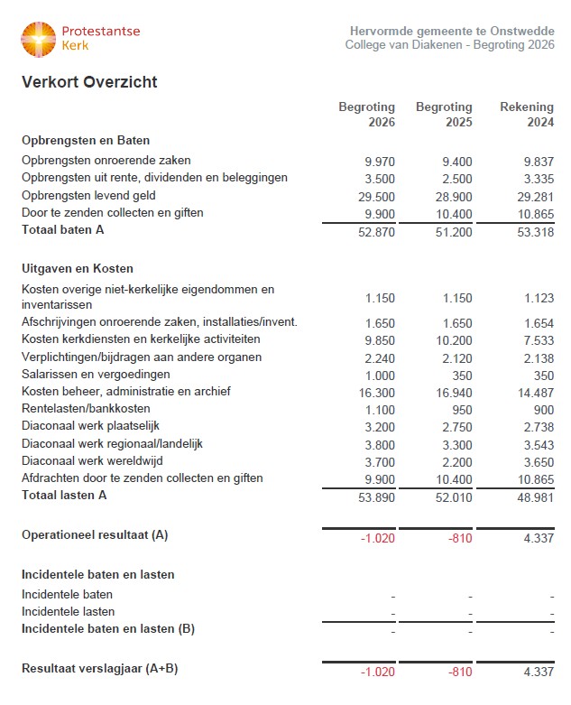 Onderstaande staat van baten en lasten geeft via de kolom begroting inzicht in de begrote ontvangsten en de voorgenomen bestedingen van de diaconie in het verslagjaar. De kolom rekening geeft inzicht in de daadwerkelijk gerealiseerde ontvangsten en bestedingen.